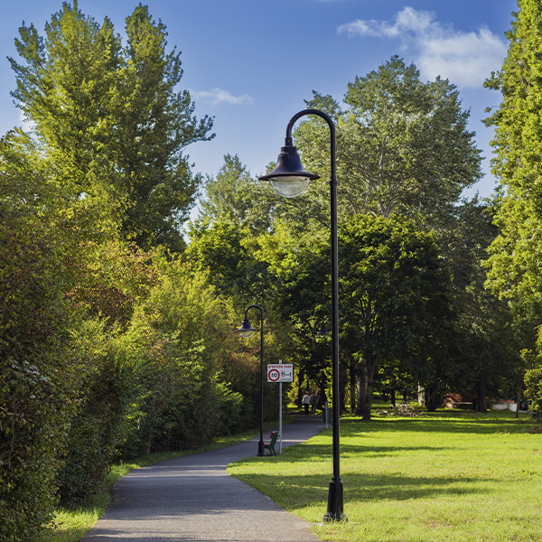 El Paseo del Arga, situado en un entorno natural rico en biodiversidad y con un clima húmedo, presenta desafíos significativos para el alumbrado exterior. Las nuevas instalaciones incluyen columnas poliméricas Primera, inmunes a la corrosión y antielectrocución, con luminarias Pescador S y Metrópoli LLC. Estos productos han sido equipados con Difusor Confort® para reducir el deslumbramiento y mejorar la experiencia visual, garantizando una iluminación uniforme y agradable.