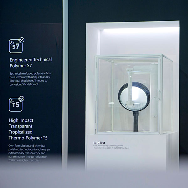 El expositor de ATP estará equipado con diversos dispositivos para que los visitantes pongan a prueba las características únicas de todos los productos de la firma, ideales para el alumbrado de zonas costeras, parques y hoteles: inmunidad a la corrosión, antielectrocución, máxima protección contra el vandalismo (IK10+) y hermeticidad integral (IP66+). Así, por ejemplo, se podrá emplear una maza para comprobar la resistencia de los difusores ATP, o ver una luminaria de la marca recibiendo chorros de agua desde todos los ángulos sin que nada de líquido penetre en la cubierta polimérica.
