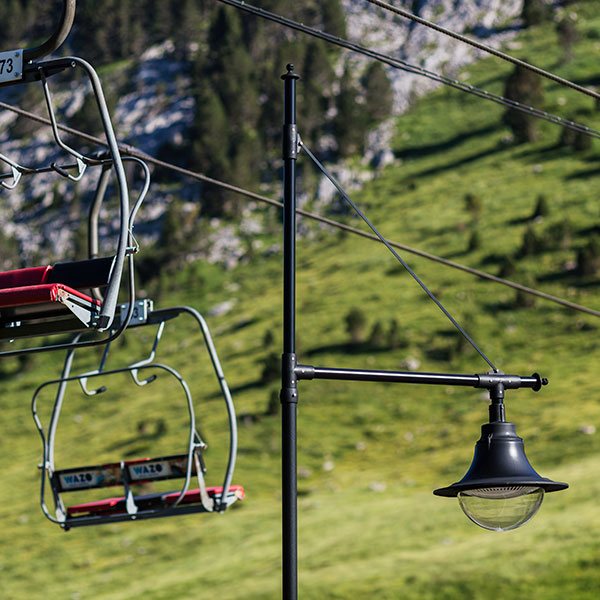 Uno de los puntos clave del proyecto ha sido la homogeneización estética del núcleo urbano. Candanchú presentaba una gran dispersión de modelos y marcas de luminarias. Ahora, todo el sistema ha sido unificado con el modelo Pescador de ATP con Difusor Confort® para eliminar el deslumbramiento, reforzando la coherencia visual y adaptándose a la arquitectura local de montaña.