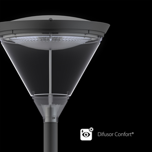 Opcionalmente, tanto las Cónicas como las Venus LED pueden suministrarse con Difusor Confort®, una pantalla de polímero técnico especialmente concebida para mitigar el deslumbramiento de los viandantes sin sacrificar la eficiencia y rendimiento extraordinarios de la tecnología de diodos.