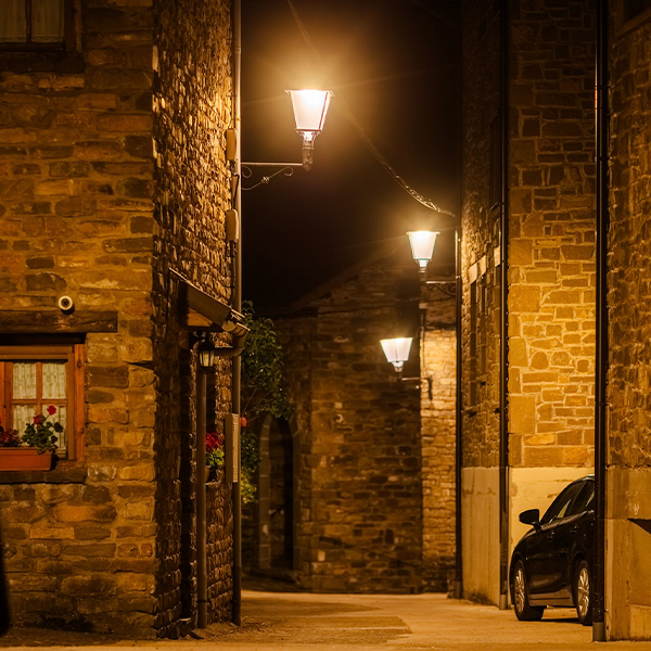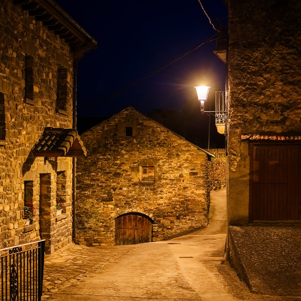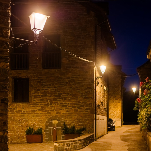 Para este proyecto se seleccionaron luminarias Villa XLA de cuatro caras con Difusor Confort® y temperatura de color ultracálida de 2200 K. Su diseño clásico encaja a la perfección con la fisonomía del núcleo urbano, reforzando la coherencia visual entre la iluminación y la arquitectura tradicional.