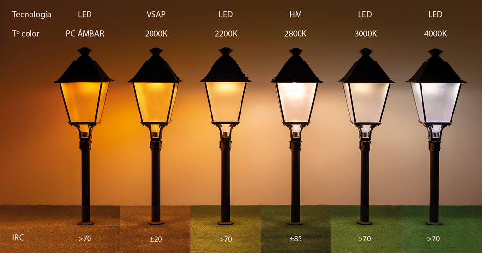 *3000 K, 2700 K, 2200 K y PC Ámbar.